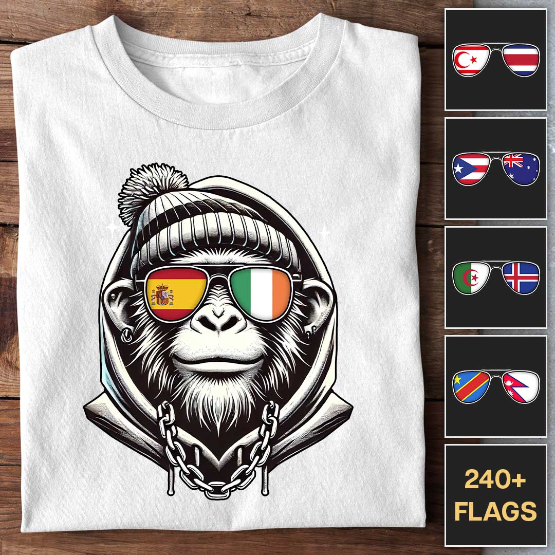 Express your unique style with the Flag Shades Ape customizable T-Shirt, featuring a cool 3D ape wearing custom flag sunglasses. Choose two country flags to proudly display in the shades, making this tee perfect for showing off your national pride or love for travel. Made from soft cotton, it's ideal for everyday wear or as a personalized gift for those with a connection to multiple countries. Stand out with this one-of-a-kind design that combines comfort, style, and cultural pride.