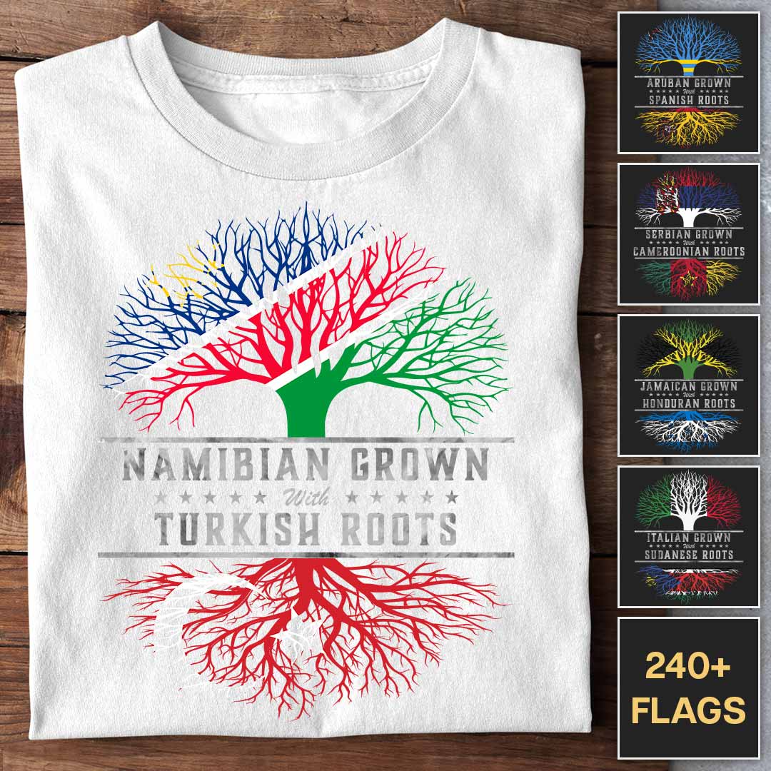 Show off your heritage with the Grown with Roots customizable T-shirt. Personalize this design by selecting two countries: the tree proudly displays the flag of one country, while the roots showcase the other. Whether it’s your homeland or ancestral origins, this unique design celebrates where you're from. Choose your flags and create a personal story that’s deeply rooted in your identity.
