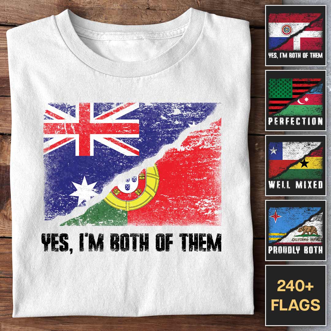 Show your pride for two countries with the Proud Flags customizable T-shirt. The design merges two country flags into one, creating a visually striking, seamless look. Choose your countries and select a quote like "Great Mix" or "Proudly Both" to make this shirt your own.
